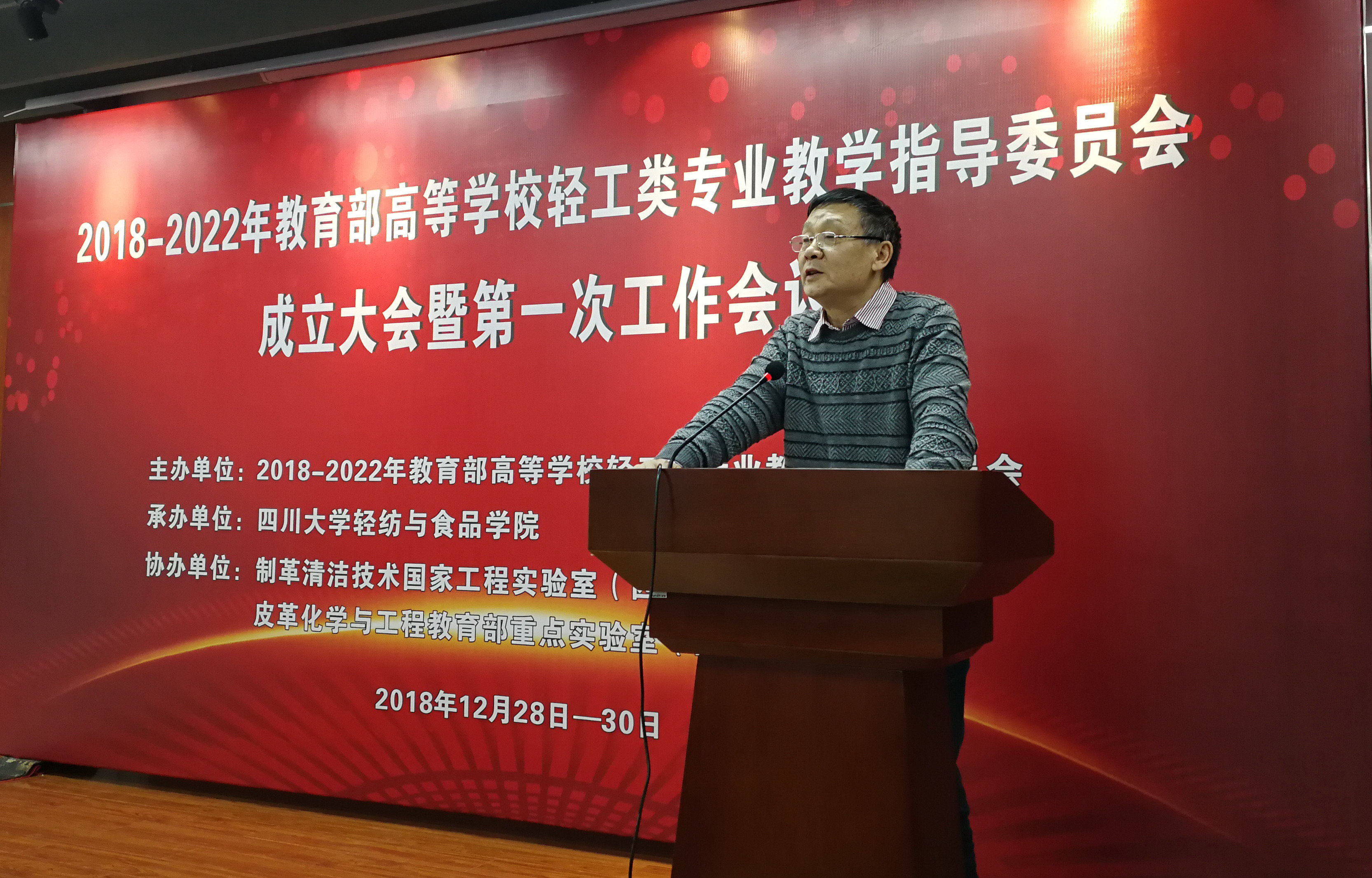 为全面贯彻落实全国教育大会精神、新时代全国高等学校本科教育工作会议和教育部2018-2022年高等学校教学指导委员会成立会议精神,研讨筹划轻工类教指委工作,2018年12月28日至30日,由“教育部高等学校轻工类专业教学指导委员会”主办,一竞技官网一竞技官网承办,制革清洁技术国家工程实验室和皮革化学与工程教育部重点实验室协办,“2018-2022年教育部高等学校轻工类专业教学指导委员会(以下简称“轻工类教指委”)成立大会暨第一次工作会议”在一竞技官网(四川成都)隆重召开。