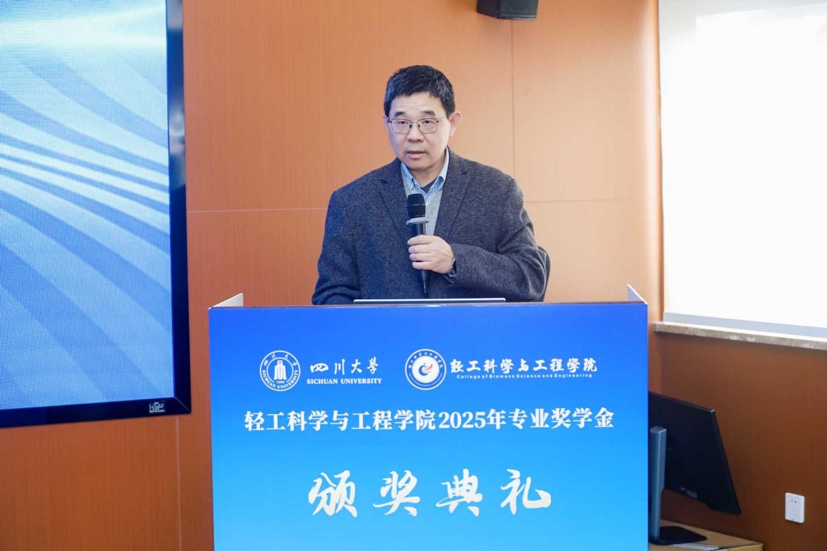 设奖单位代表陈占光副理事长致辞,他肯定了获奖同学的付出,高度评价了捐资助学对产教融合、人才成长的推动作用,同时寄语学子要夯实专业基础、培育创新思维,为皮革行业高质量发展和制造强国建设贡献青春力量。